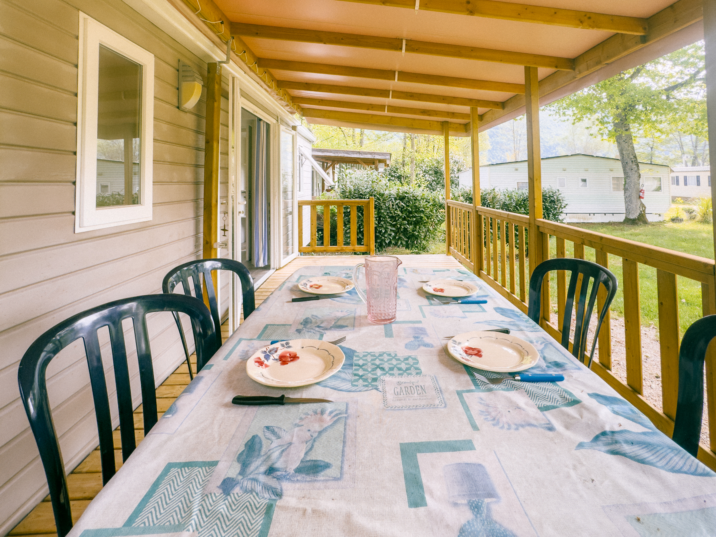 Een overdekt houten terras: tafels, tuinstoelen en houtskoolbarbecue (op aanvraag).